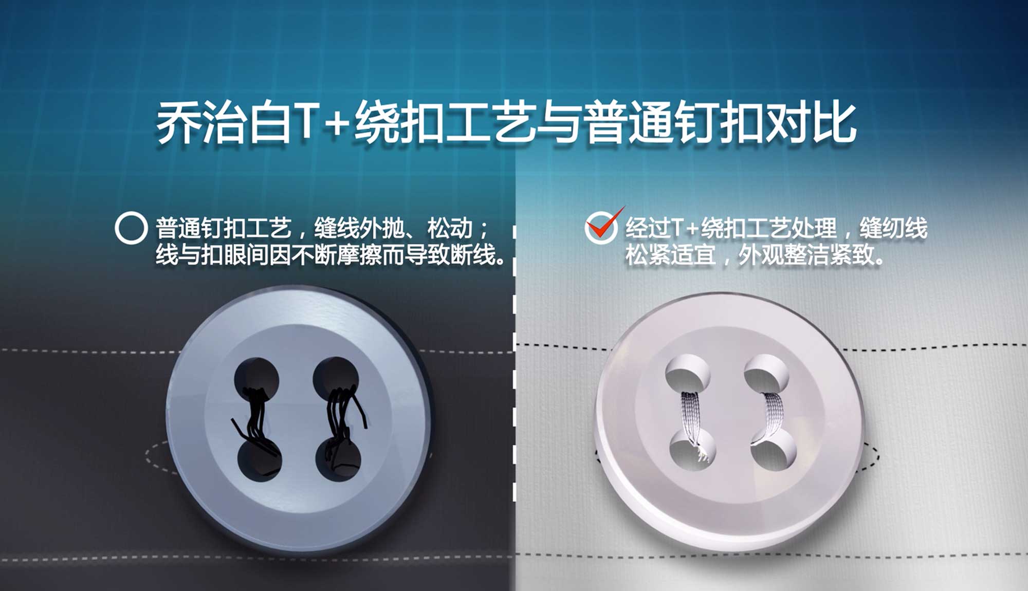 纽扣坚挺直立,扣眼紧致,